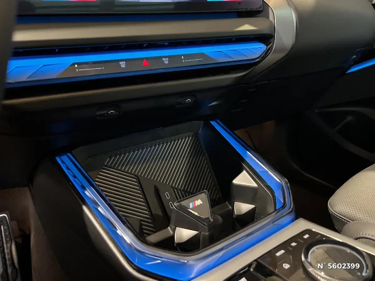 - Eclairage d'ambiance Rétroéclairage des éléments suivants (15 couleurs au choix): Poignées de portes AV, Partie inférieure du BMW Curved Display, Emplacement recharge sans fil smartphone, Contour du porte-gobelet, BMW Interaction Bar à l'aspect de verre cristallin, rétroéclairée dynamiquement.