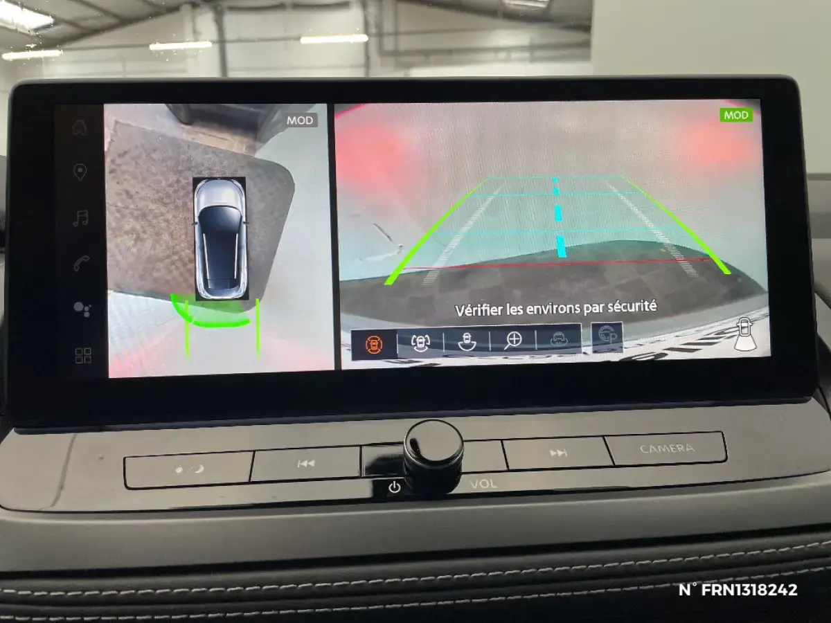 - Nissan AVM 3D - Vision Intelligente à 360° : système d'aide au stationnement qui facilite les manoeuvres de stationnement en vous offrant une vision à 360° : Caméra AR avec repères de gabarit, Caméra AV, Caméras latérales situées dans les rétroviseurs extérieurs, Radars 360°, Fonction ''capot transparent'', Mémorisation stationnement régulier et intersections