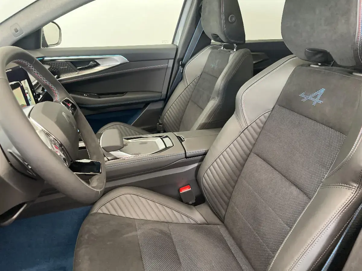 - Sellerie mixte Alcantara avec surpiqures bleues et logo Alpine lumineux