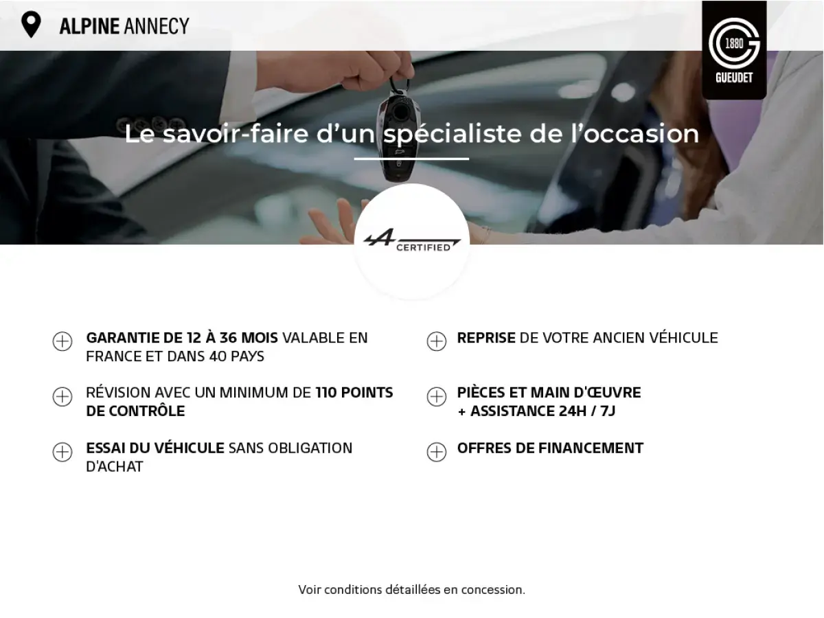 Le calendrier d'entretien de cette A110 a été soigneusement respecté et effectué dans le réseau ALPINE pour vous garantir un achat en toute sérénité