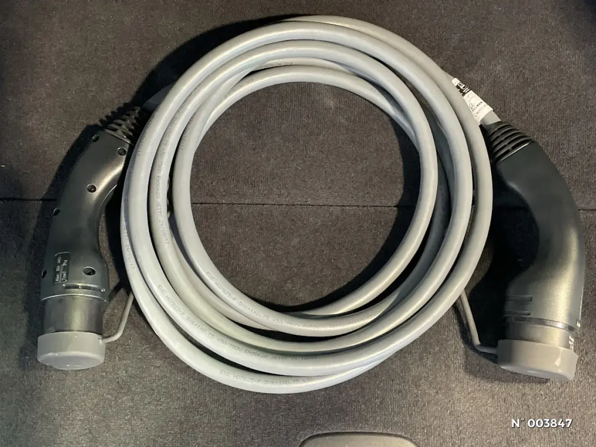 - Câble de recharge Professionnel Mode 3 (T2-T2) 22 kW pour la recharge publique - 5 mètres Câble de recharge de Mode 3 avec des branchements Type 2 - Type 2 monophasés d'une longueur de 5 mètres destiné à la recharge publique et venant en complément du câble de recharge occasionnel de Mode 2. Ce câble est placé dans un sac et rangé et attaché à l'oeillet à l'intérieur du compartiment à bagages principal ayant un crochet, à côté du câble de Mode 2.