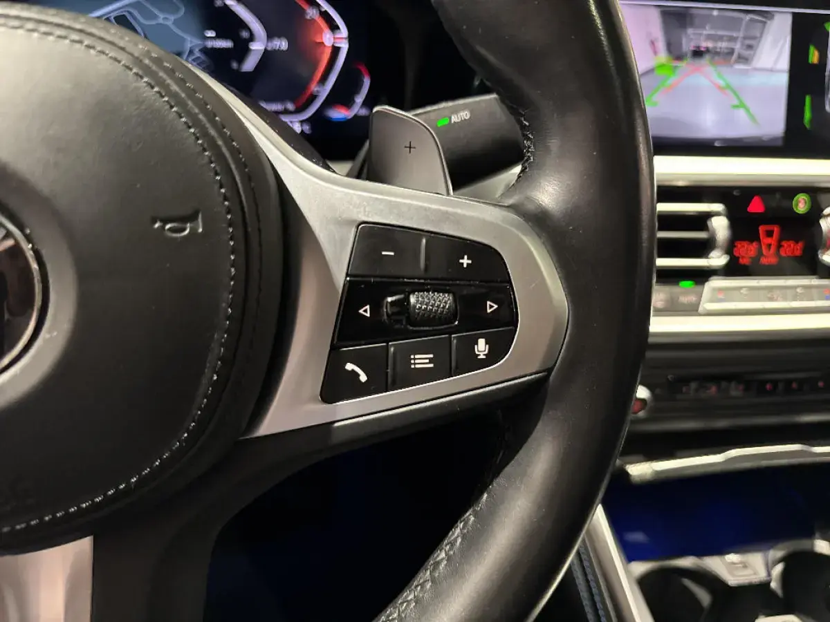 - Volant M gainé cuir Trois branches, aplati en bas et marque à 12 heures en noir. Volant en cuir noir 'Walknappa' avec surpiqûres noires, inserts chrome nacré et repose-pouce dans le volant. Logo M sur la base du volant.