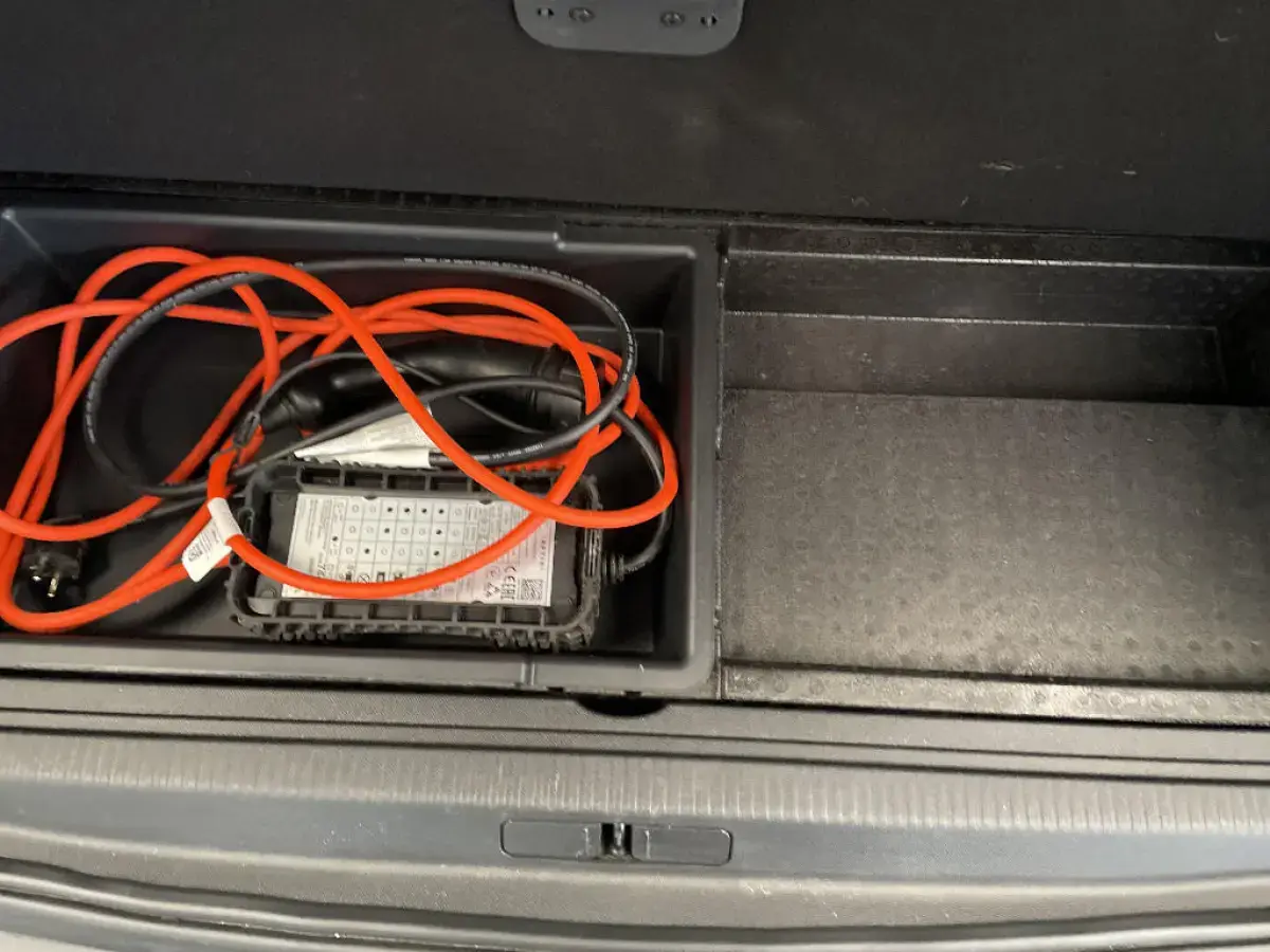 - Plancher de coffre fixe avec articulation pour accès au coffre de rangement du câble de recharge