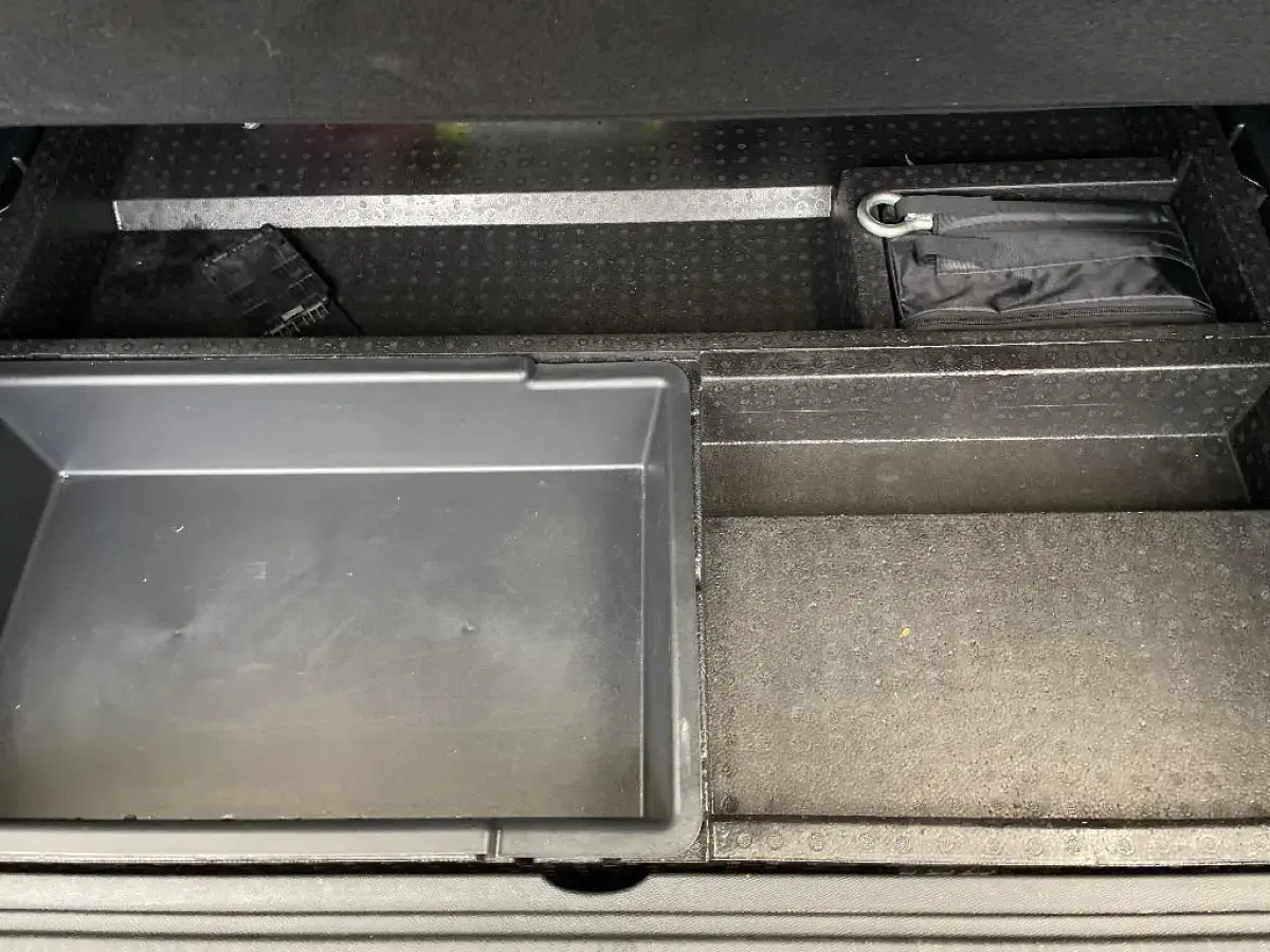 • Plancher de coffre fixe avec articulation pour accès au coffre de rangement du câble de recharge