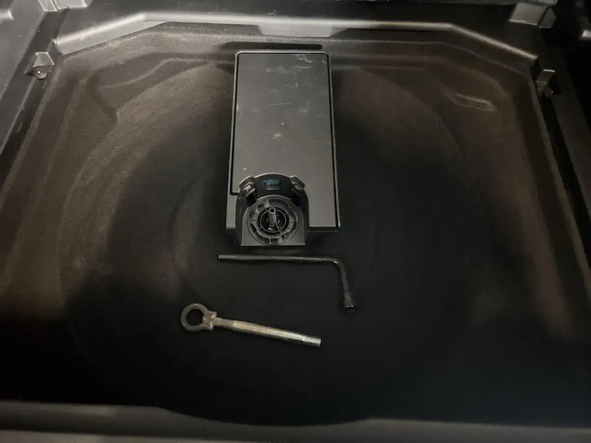 - Kit de dépannage de pneumatique : compresseur 12 volts, flacon de produit de colmatage, anneau de remorquage, deux cales de roue, manivelle de frein de stationnement électrique