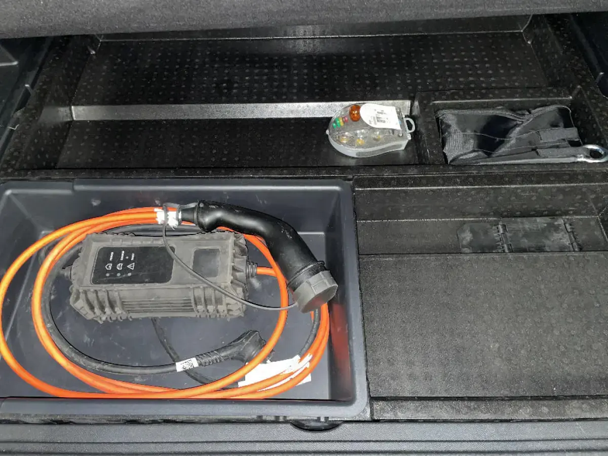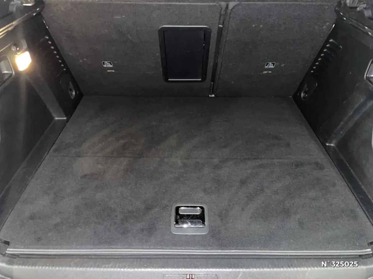 • Plancher de coffre fixe avec articulation pour accès au coffre de rangement du câble de recharge