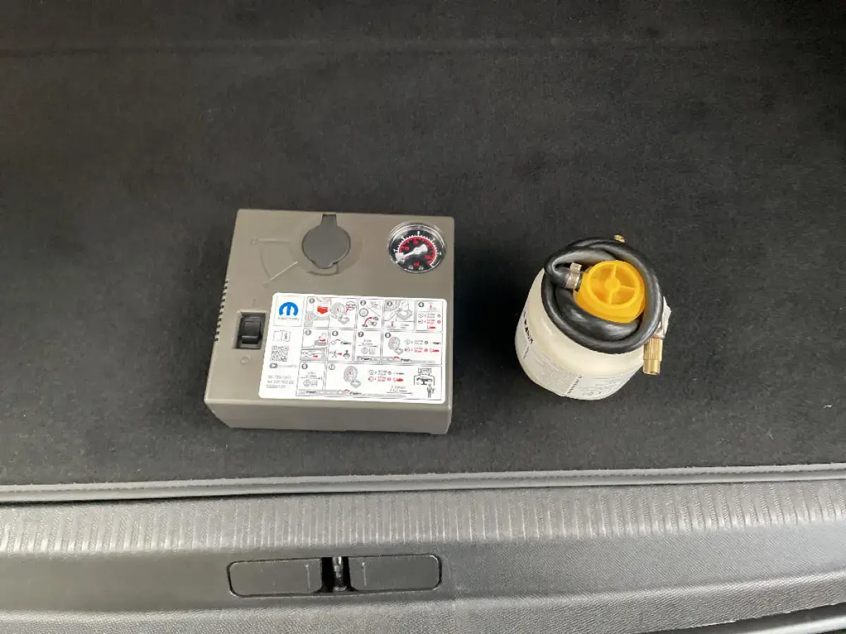 - Kit de dépannage de pneumatique : compresseur 12 volts, flacon de produit de colmatage, anneau de remorquage, deux cales de roue, manivelle de frein de stationnement électrique