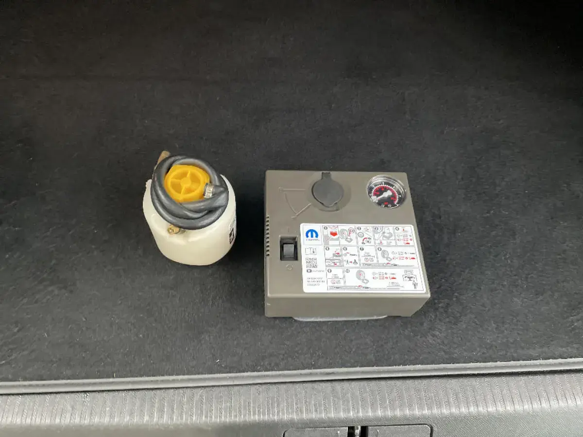 - Kit de dépannage de pneumatique : compresseur 12 volts, flacon de produit de colmatage, anneau de remorquage, deux cales de roue, manivelle de frein de stationnement électrique