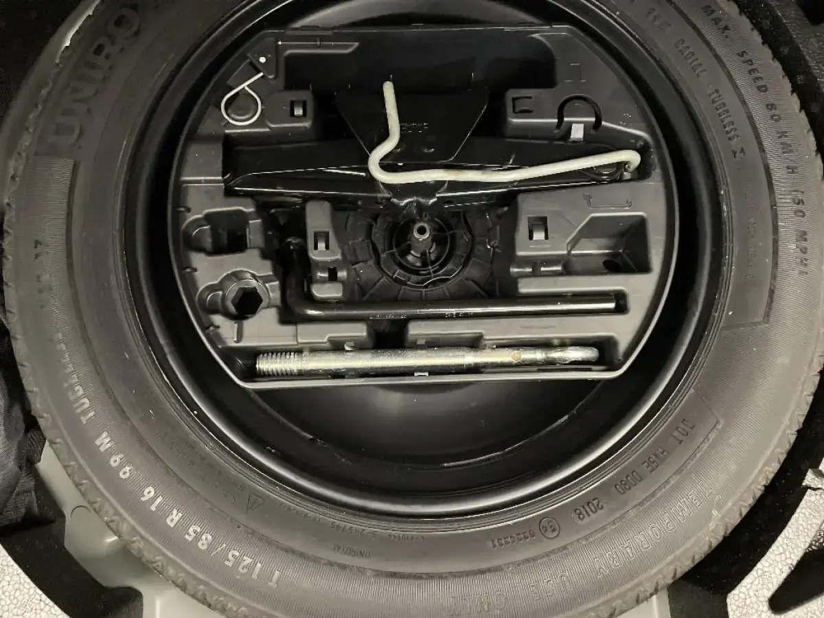 - Kit de dépannage de pneumatique : compresseur 12 volts, flacon de produit de colmatage, anneau de remorquage, deux cales de roue, manivelle de frein de stationnement électrique
