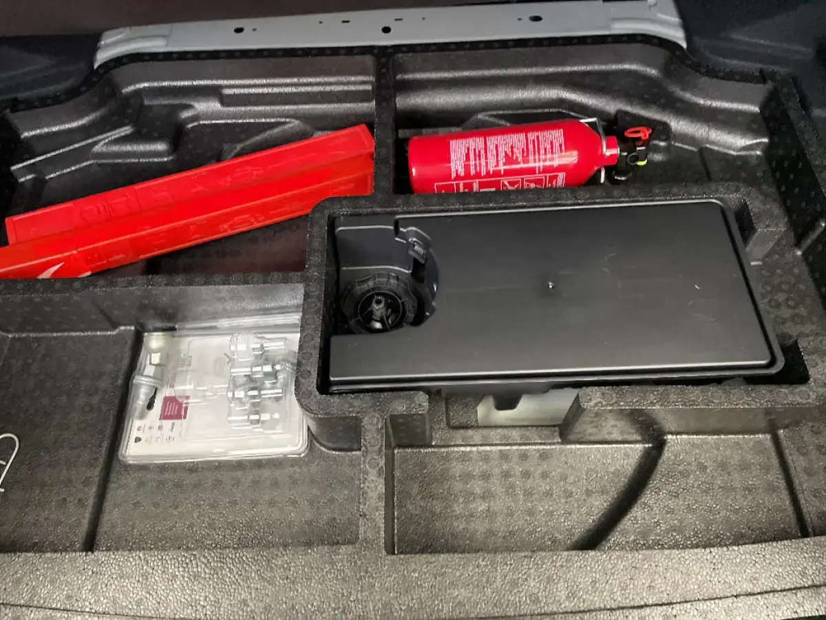 • Kit de dépannage de pneumatique : compresseur 12 volts, flacon de produit de colmatage, anneau de remorquage, deux cales de roue, manivelle de frein de stationnement électrique