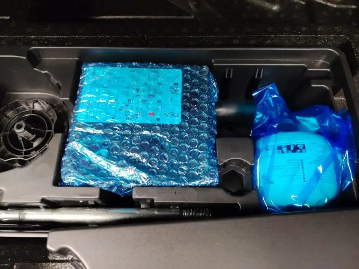 • Kit de dépannage de pneumatique : compresseur 12 volts, flacon de produit de colmatage, anneau de remorquage, deux cales de roue, manivelle de frein de stationnement électrique