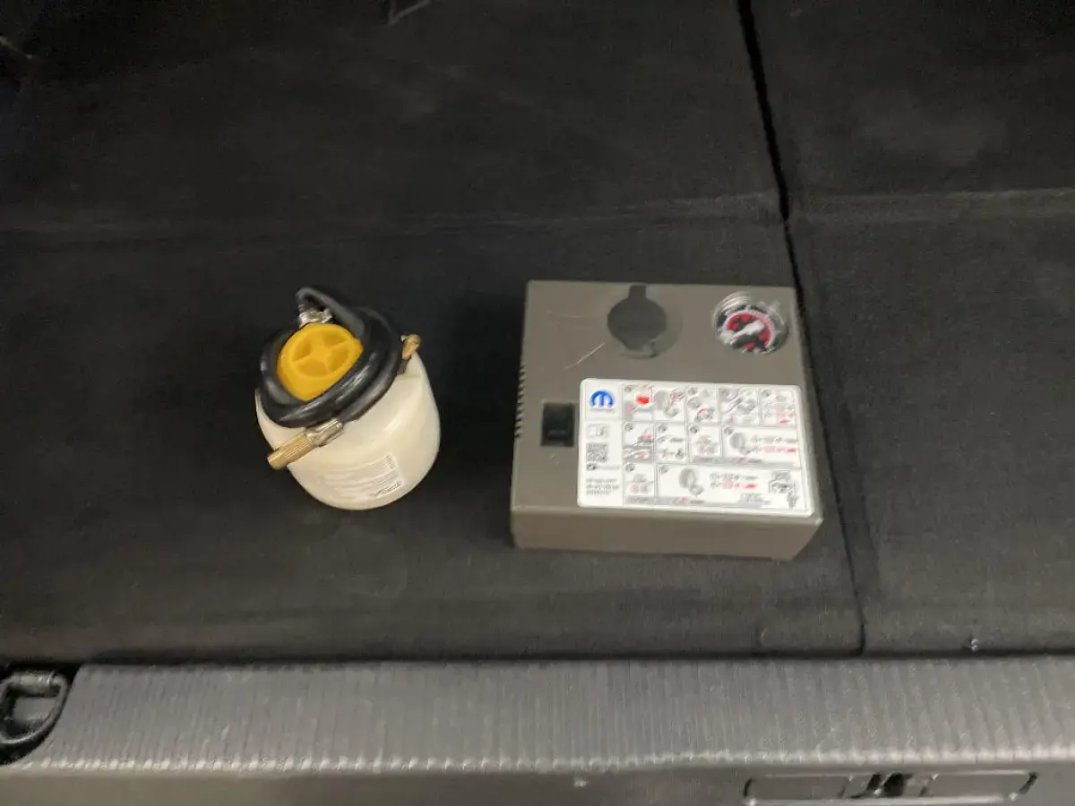 - Kit de dépannage de pneumatique : compresseur 12 volts, flacon de produit de colmatage, anneau de remorquage, deux cales de roue, manivelle de frein de stationnement électrique