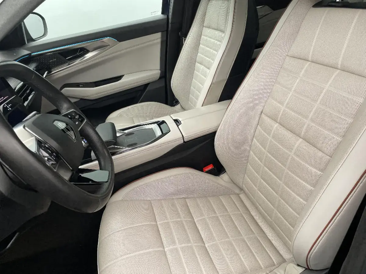 - Sellerie cuir gris sable clair perforée avec surpiqures et joncs ambrés