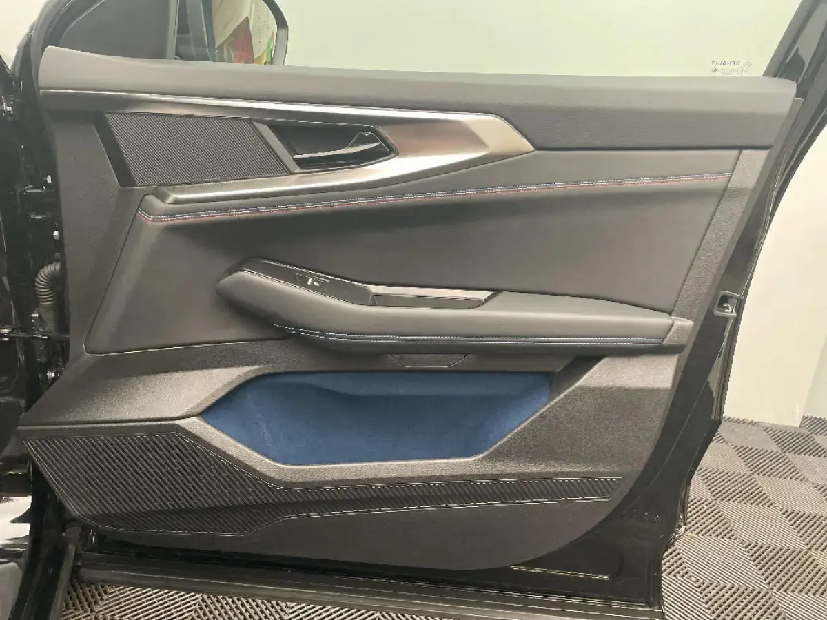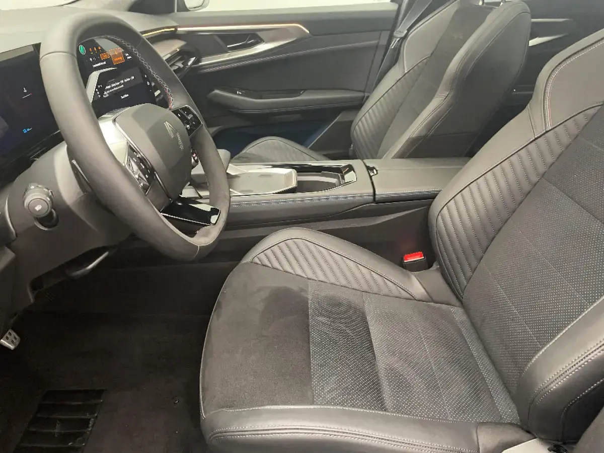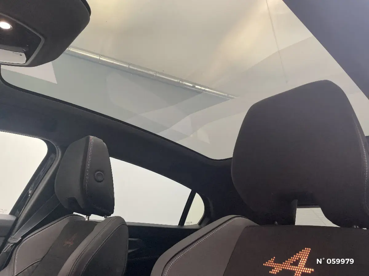 - Sellerie mixte Alcantara avec surpiqures bleues et logo Alpine lumineux