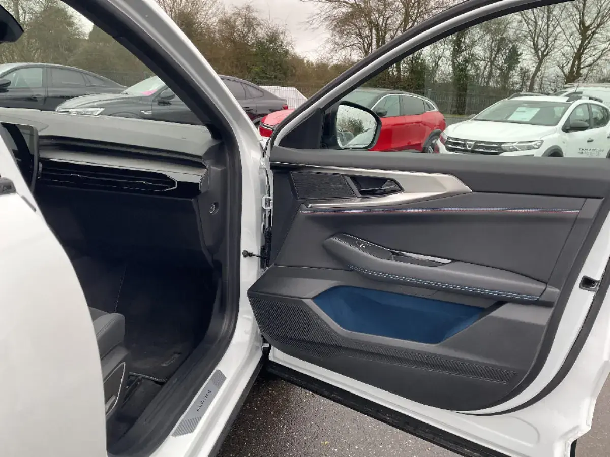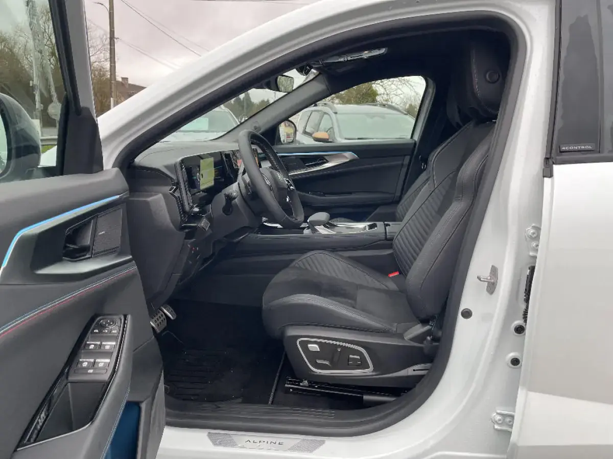 - Sellerie mixte Alcantara avec surpiqures bleues et logo Alpine lumineux